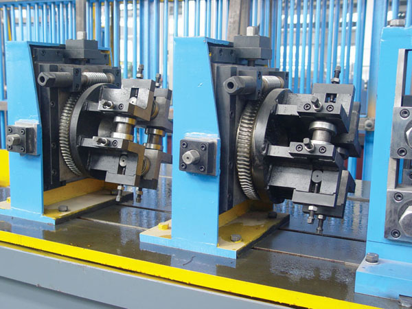 Manufacturing process of steel pipe production line is made of uncoiling, molding, welding, polishing, sizing, straightening and cutting, etc. Rolling speed can be adjusted correspondingly within proper range of pipe diameter and wall thickness.